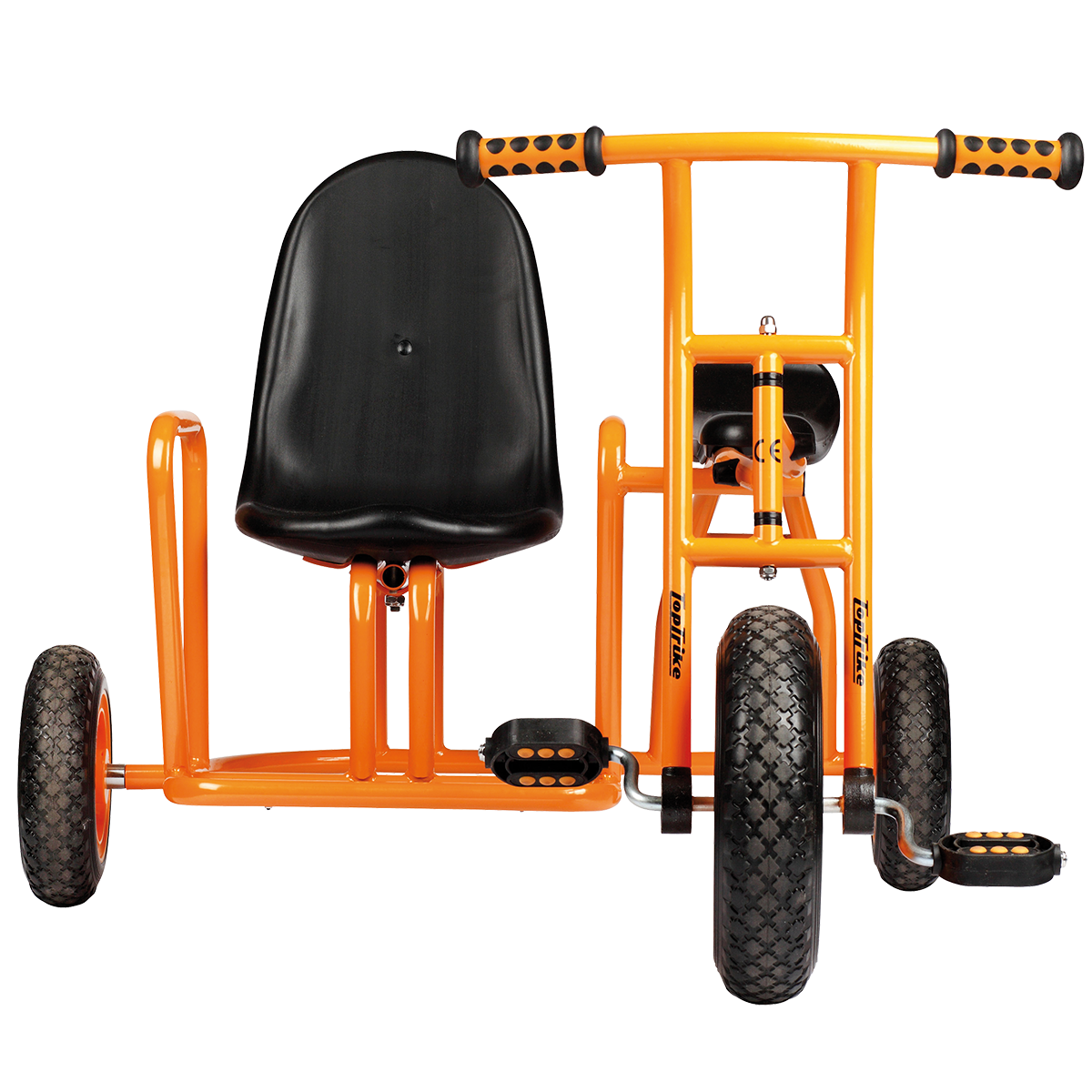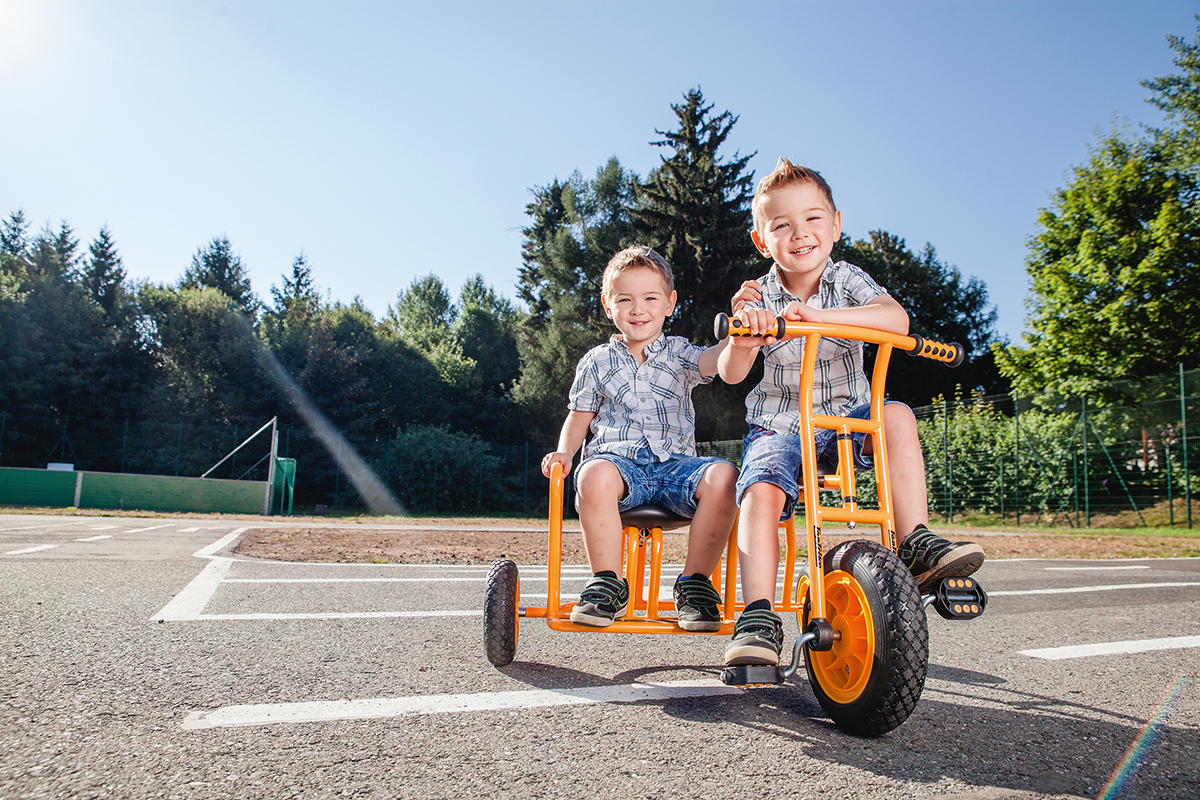 Zwei Abenteurer, ein Dreirad – perfekt! Mit dem „Seitenwagen" können zwei Kinder gemeinsam losfahren und die Welt entdecken. Der Beifahrer hat dabei freie Sicht nach vorne und erlebt jede Kurve hautnah mit. Gemeinsam macht Fahren einfach mehr Spaß!